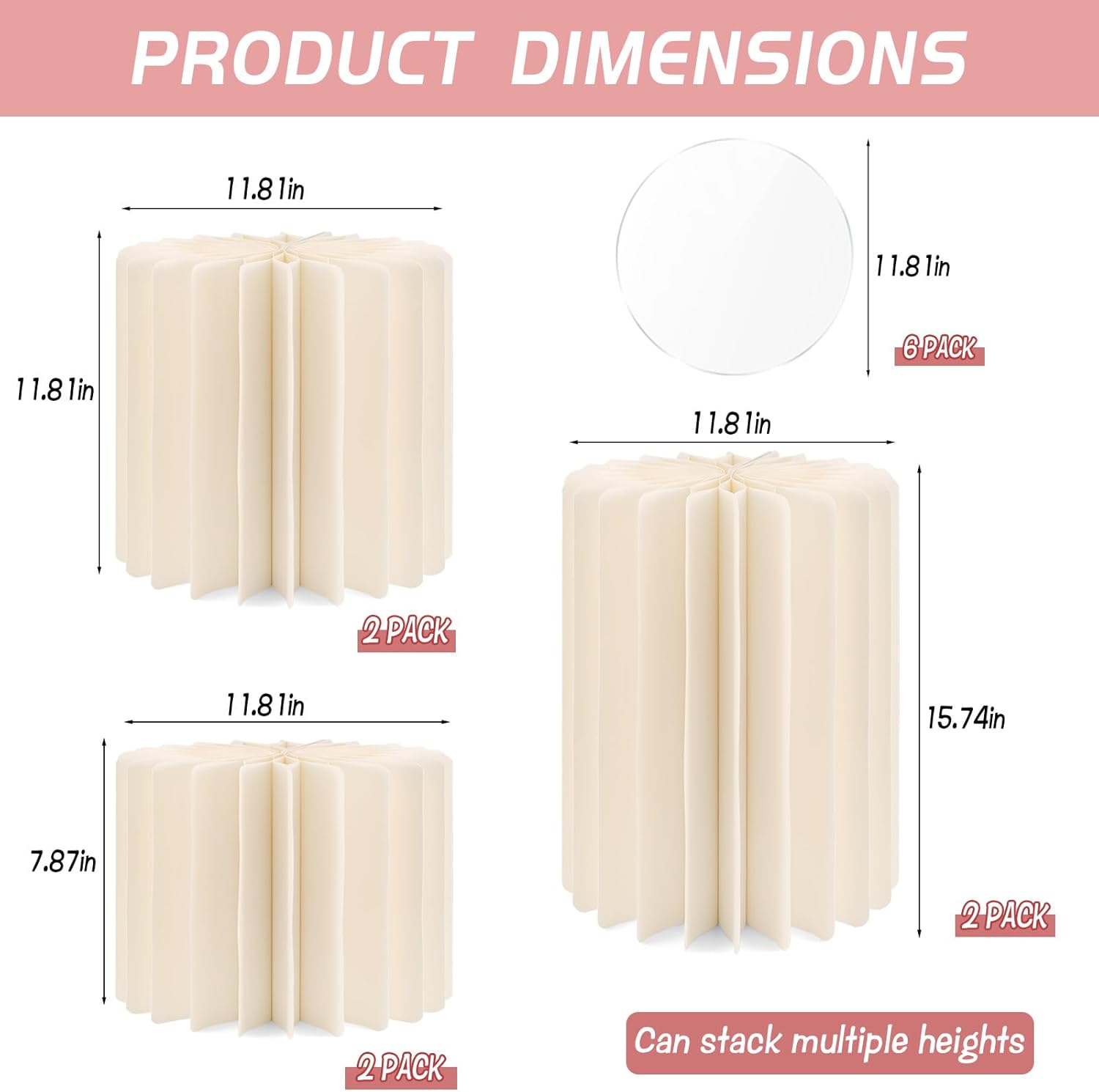 Transform any space into a professional event venue with the EYUNSTAR 6-piece foldable cylinder pedestal stands set. This kit is the ultimate solution for anyone seeking versatile and elegant display risers. The unique modular design allows for stacking, creating everything from a sophisticated tall cake stand to dynamic, multi-level stands for party decorations. These are more than just tables; they are foundational prop stands that bring your creative vision to life.Crafted from high-density, reinforced cardboard, each round pillar is built for stability and repeated use. The foldable stand design is a game-changer for storage and portability, collapsing in seconds to become a compact set of collapsible risers. Whether you are a professional planner or a DIY host, you'll appreciate the convenience of this portable cardboard stand. Each display pedestal is finished in a timeless cream white and includes a protective acrylic disc, making it an ideal cake table stand for party events.These stands are essential for a wide range of celebrations. Use them as majestic wedding pillars or columns for decoration, creating breathtaking aisles and altars. For birthdays and family gatherings, they serve as the perfect pedestal cake stand or a complete dessert table display. Their versatility also makes them perfect as cilindros para fiestas, adding a touch of class to any festive occasion. For vendors, they are professional display stands that elevate your products at markets and trade shows.This comprehensive kit includes six foldable cardboard columns in three heights (20cm, 30cm, 40cm pairs, all 30cm diameter) and six clear acrylic tops. Move beyond basic party supplies and invest in a reusable, elegant, and incredibly functional party pedestal stand set that will serve you for countless events to come.