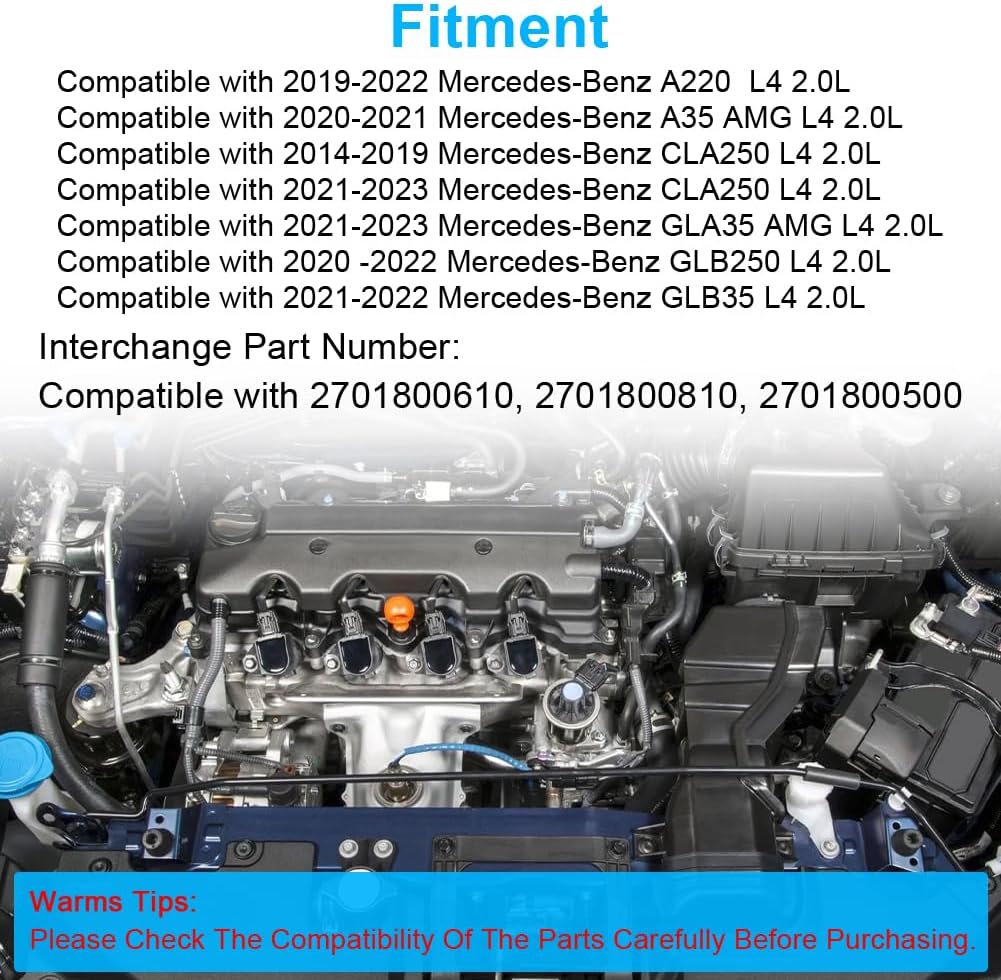 Fitment: Compatible with 2019-2022 Mercedes-Benz A220 L4 2.0L Compatible with 2020-2021 Mercedes-Benz A35 AMG L4 2.0L Compatible with 2014-2019 Mercedes-Benz CLA250 L4 2.0L Compatible with 2021-2023 Mercedes-Benz CLA250 L4 2.0L Compatible with 2021-2023 Mercedes-Benz GLA35 AMG L4 2.0L Compatible with 2020 -2022 Mercedes-Benz GLB250 L4 2.0L Compatible with 2021-2022 Mercedes-Benz GLB35 L4 2.0LBenefits of Replacing Old Oil Cooler: 1. Improved Engine Performance 2. keep The Engine from OverheatingPackage Included: 1X Engine Oil CoolerInterchange Part Number: Compatible with 2701800610, 2701800810, 2701800500Warm Tips: Please check the description or interchangeable part numbers to confirm the compatibility before purchasing.