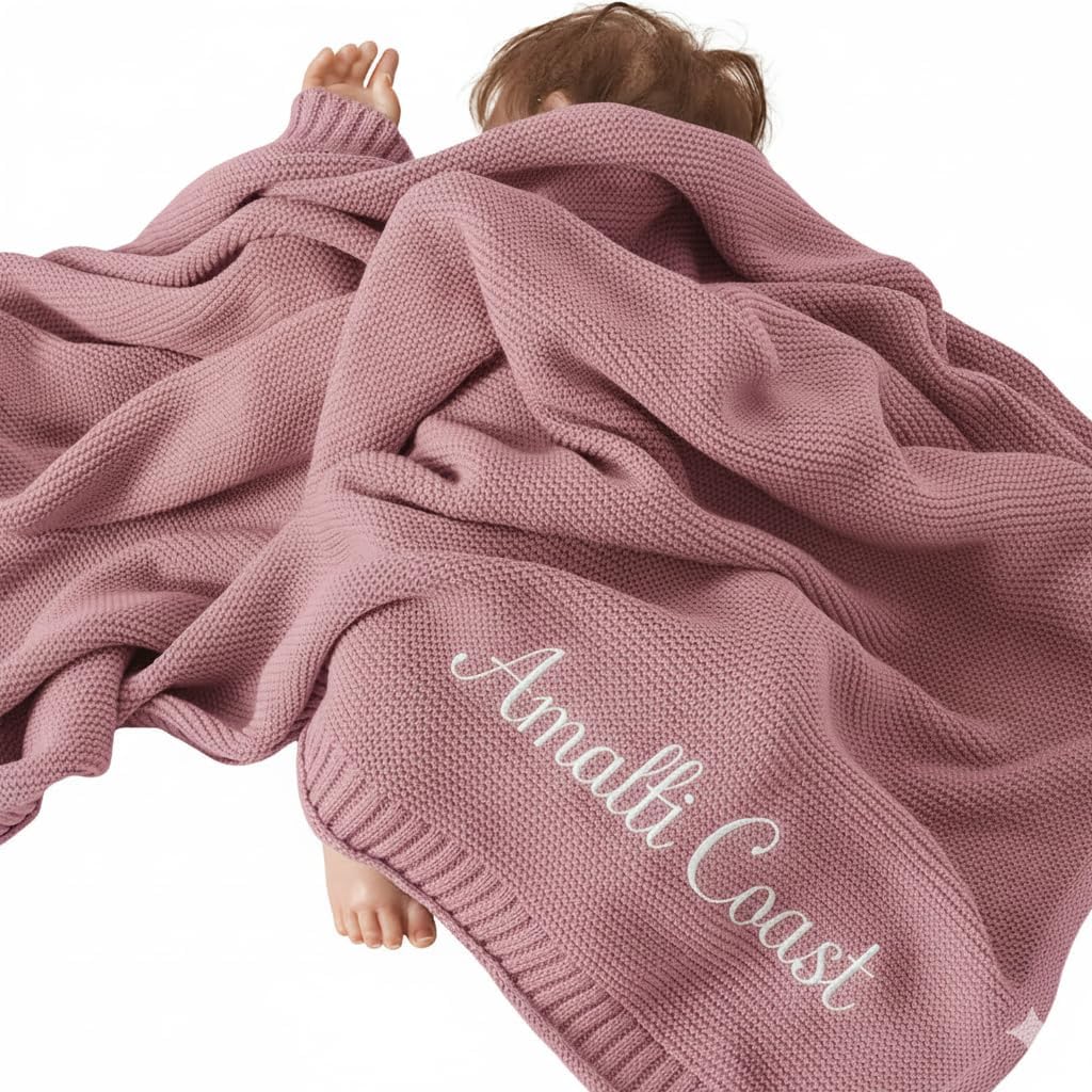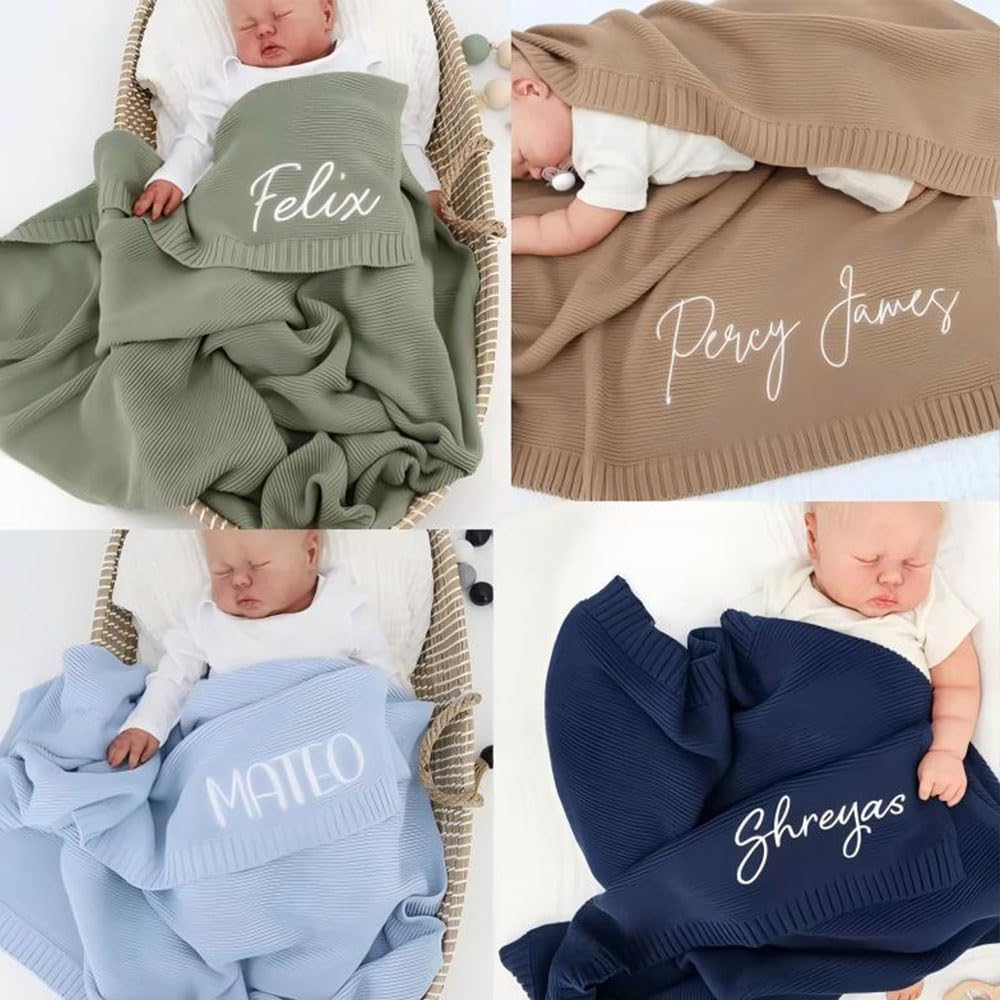 Custom Embroidered Knit Baby Blanket: Personalize this knit blanket with your chosen name to create unique keepsake for your little one. Our hand-knit blankets are designed to be a cozy and comforting addition to your baby's nursery, with the option to add a personal touch through embroidery. Experience the soft, breathable comfort that only pure cotton can provide. This material is not only gentle on your baby's skin but also ensures that they stay warm and comfortable throughout the day and night. Ideal Baby Shower : This customized blanket is the perfect size to fit in strollers, making it an excellent gift for baby showers. It's thoughtful present that new parents will appreciate for its practicality and sentimental value.Wide Range of Customization Options: Choose from variety of thread colors and font styles to truly personalize your blanket. Whether you want classic look or something more whimsical, we have options to suit every taste and make your blanket as unique as your baby.